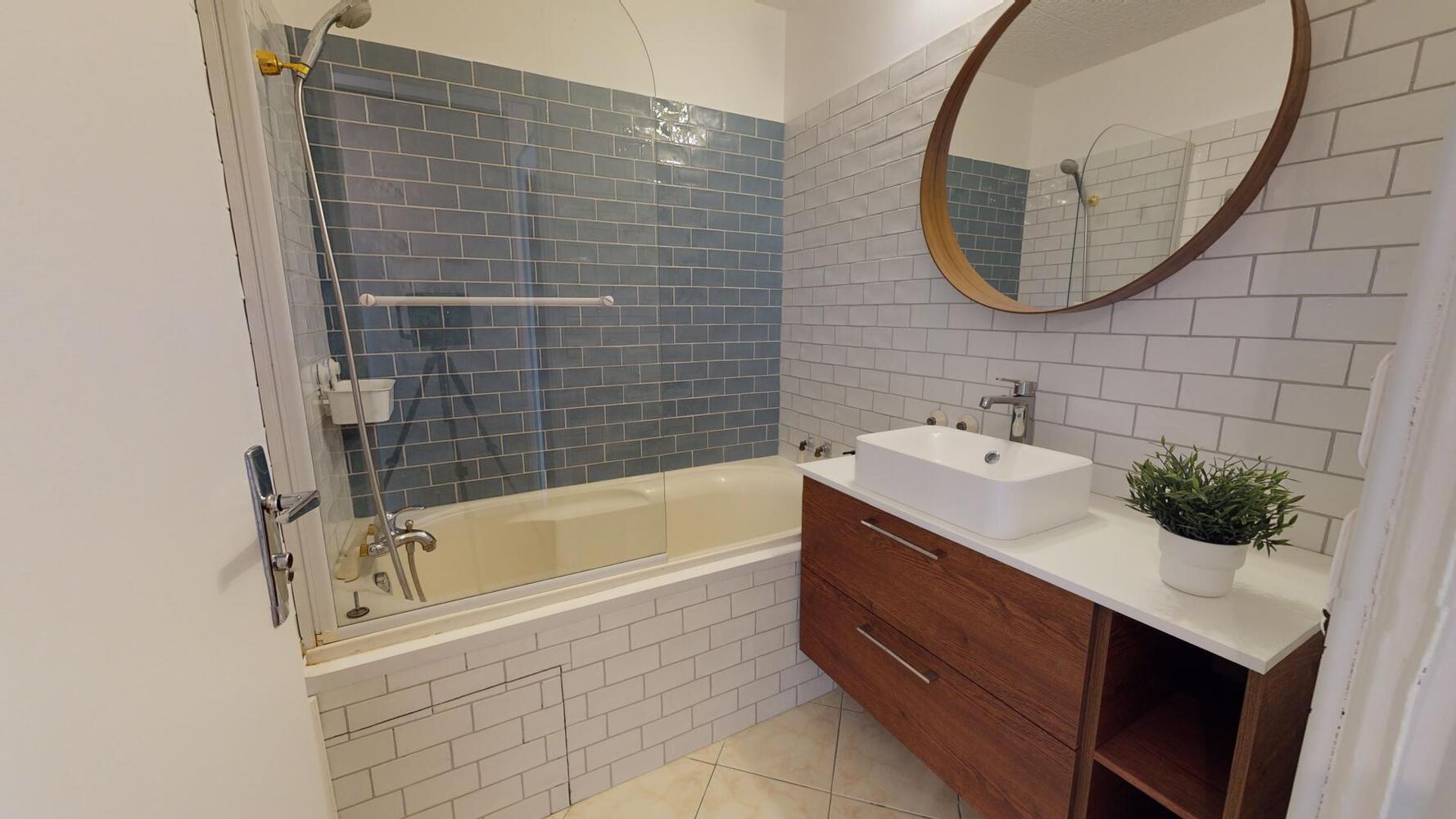 L’autre, à proximité de l’entrée, avec une baignoire et un meuble vasque.