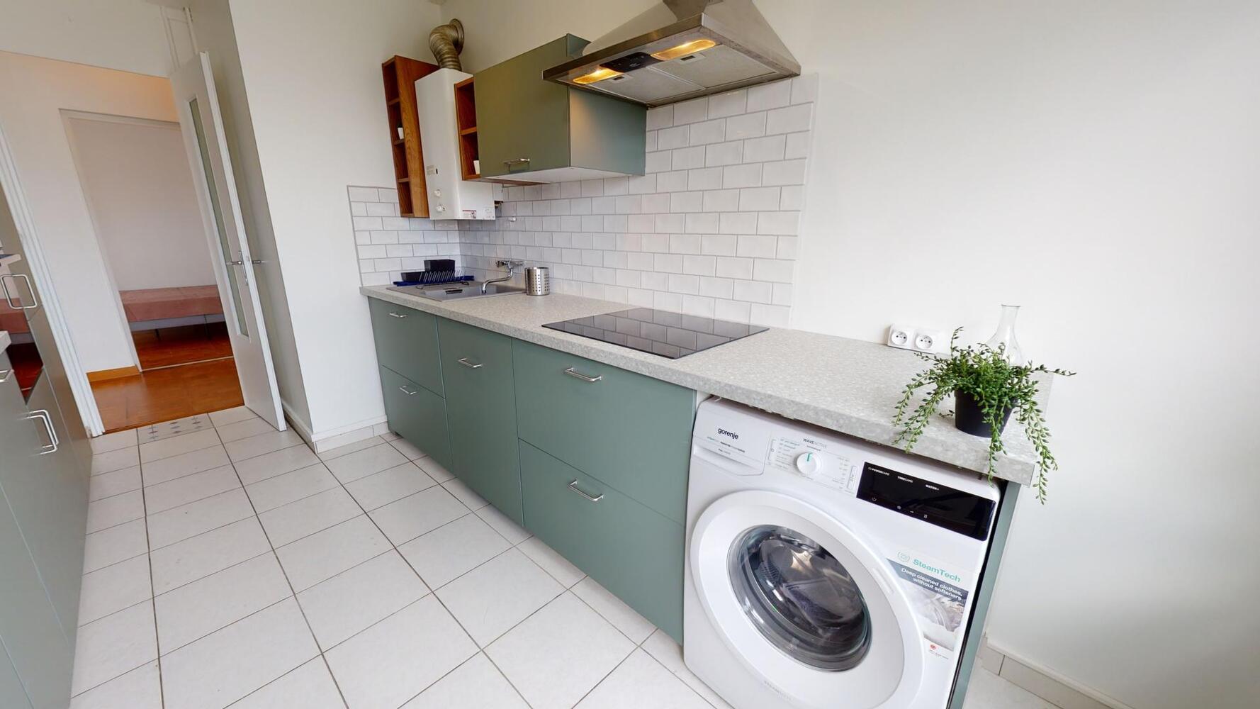 La cuisine, entièrement rénovée à l’été 2021, est séparée et entièrement équipée : plaques de cuisson, hotte, four, micro-ondes, réfrigérateur, machine à laver et de nombreux rangements.