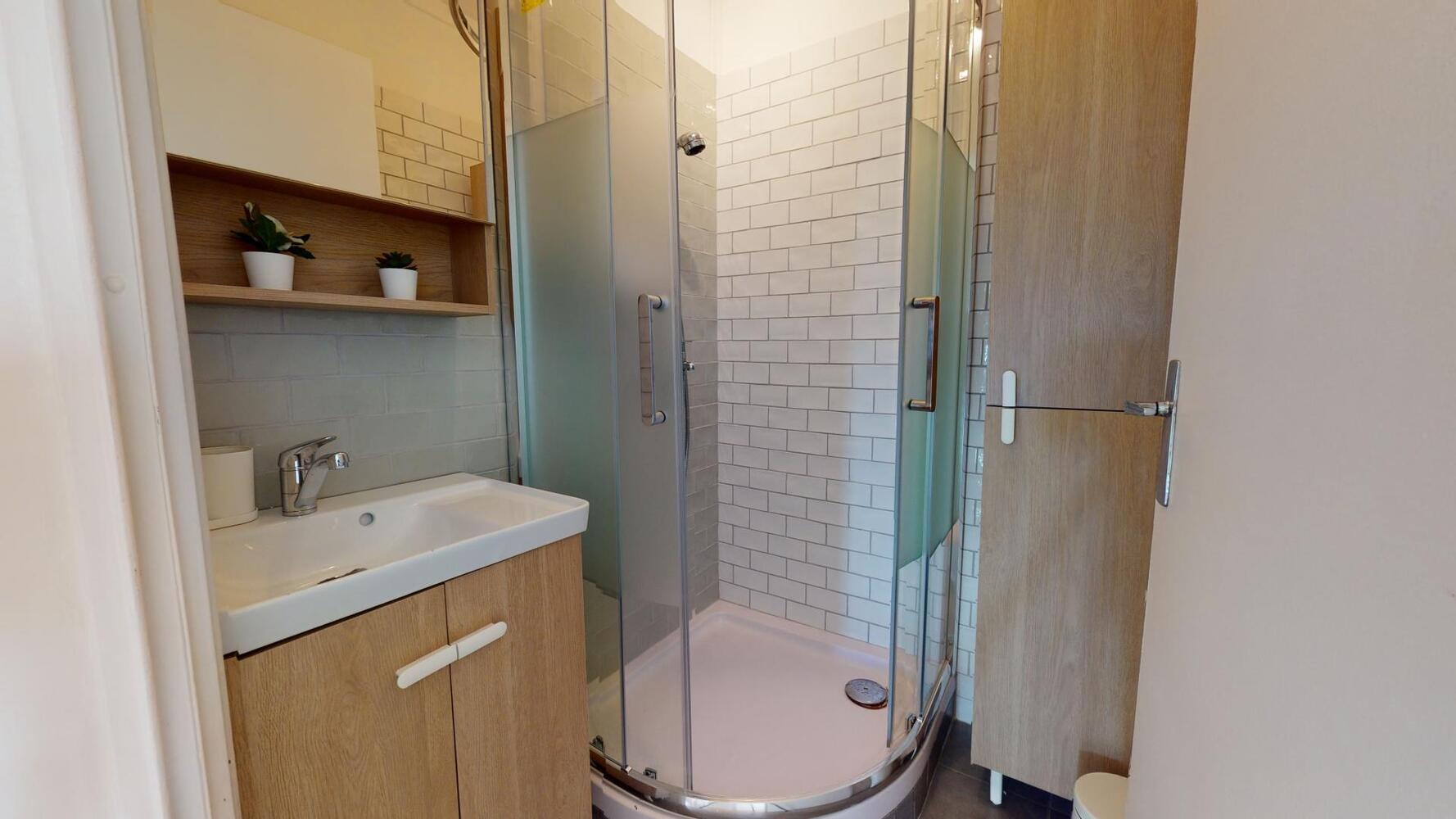 L’une, située au fond du couloir, équipée d’une douche et d’un meuble vasque.