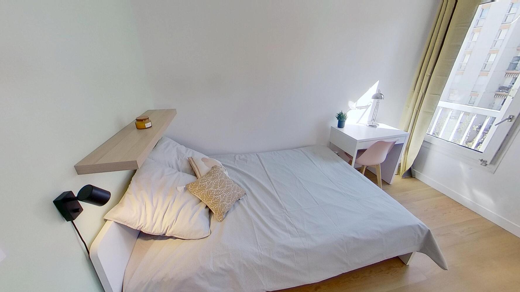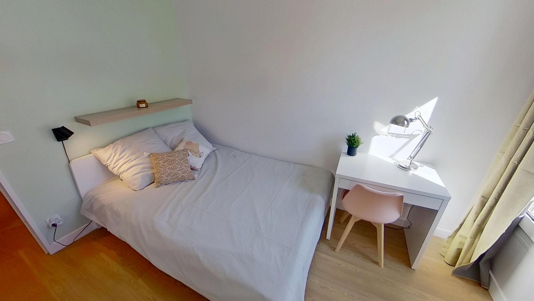 Chaque chambre est entièrement meublée (lit, rangements, bureau, couette et oreillers fournis). Le matériel de ménage est mis à disposition pour la colocation.