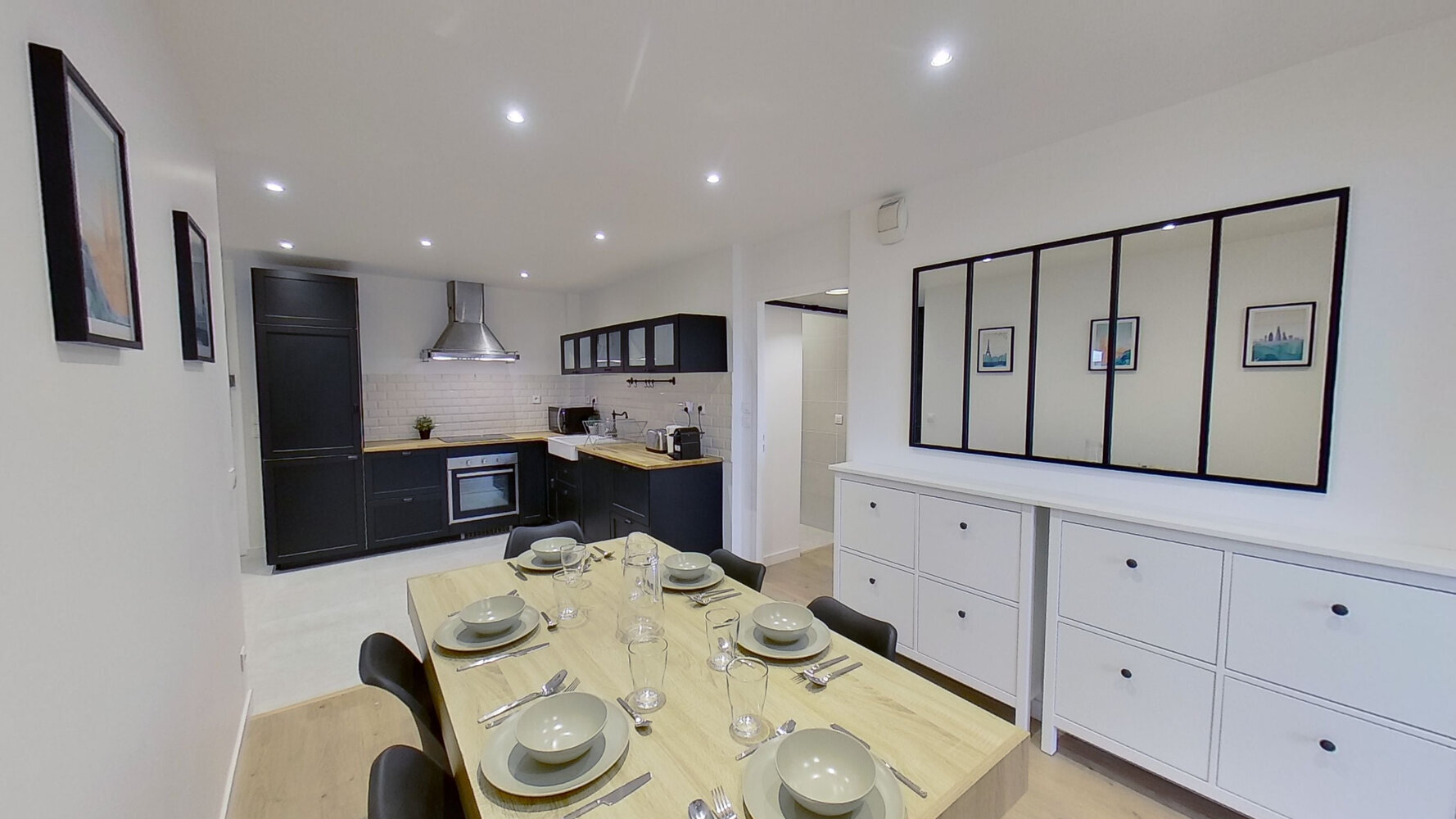 Une cuisine moderne, entièrement équipée (four, micro-ondes, lave-vaisselle, grand réfrigérateur, ustensiles de cuisine)
